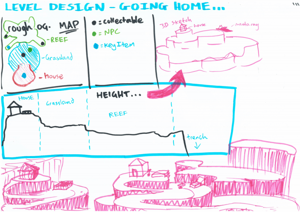 As we identified as a group, key level design was missing from the ‘Going Home’ GDD; such as height/depth, any overlapping areas and key visuals.