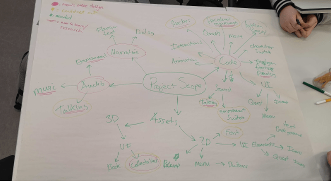 From this scope mind map we then created a shared google document containing all of the individual elements we would have to make and labeled how important they were.